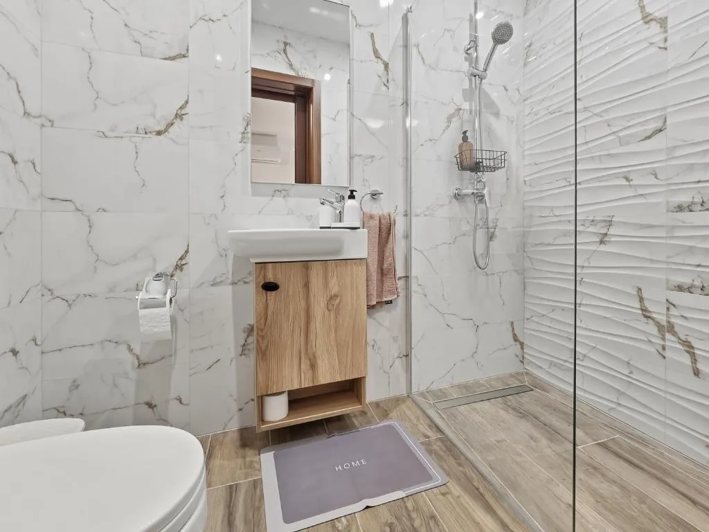 Appartement spacieux avec deux chambres et deux salles de bains.